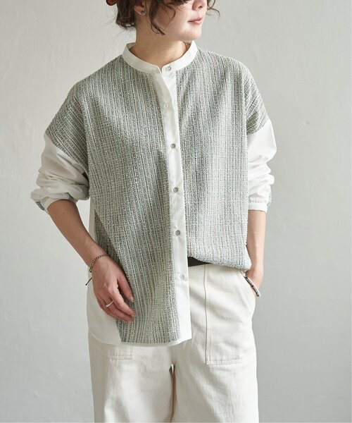 部分的にツイード生地を切り替えた異素材シャツ。 ほどよい立体感と温もりのある表情が、秋冬コーデをさりげなく格上げします。 【素材】 ツイード生地/ワッフル生地とシャツ地の異素材。 【デザイン】 ノーカラーでオーバーサイズシャツ。 【ポイント】 袖をたくし上げられるように、袖口裏をゴム仕様に変更。 ツイード部分は細かな柄でより一枚で主役になる柄になっています。