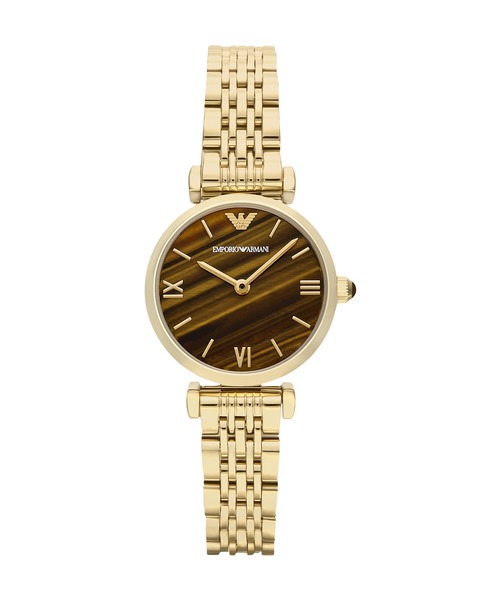 Emporio Armaniの28MM径ゴールドトーンウォッチ。エキゾチックなタイガーアイストーンのダイヤルを組み合わせました。半貴石のダイヤルとゴールドトーンのローマ数字インデックスが、ゴールドトーンのステンレススチール製ケースと複雑なブレスレットを理想的に引き立てます。 ケースサイズ:28 MM ラグ幅:12 MM 防水: 3気圧 ムーブメント:クォーツ/二針 表示:アナログ 輸入: 正規品 保証:2年間 【 EMPORIO ARMANI について 】 1981年にイタリア、ミラノで誕生したブランド。デザイナーはジョルジオ・アルマーニ。着心地と自由な発想を大切にしながら、都会的で洗練されたアイテムの数々を提案しています。イタリア語でエンポリオとは「あらゆるものが手に入る大きな市場」という意味。その名のとおり、エンポリオ アルマーニではメンズ、ウィメンズの洋服、小物はもちろん、時計や香水、アンダーウェア、スポーツウェアなど幅広いアイテムを展開しています。 < クオーツ製品の電池について > お買い上げ時に時計にセットされている電池は、動作確認用のモニター電池です。出荷前の保管期間中にも電池は消耗しており、ご購入時点で電池が切れている場合がございます。なお、電池切れは保証の対象外となりますので、あらかじめご了承ください。 < ご確認ください > ※パッケージは実際の画像と異なる場合がございます。 ※外箱には、輸送時にキズや凹みが生じる場合がございます。あらかじめご了承ください。 ※ご利用のモニター環境や照明の影響により、実際の商品と色味が異なって見える場合がございます。 ※納品書は保証書の代わりとなりますので、大切に保管していただきますようお願いいたします。 ※商品タグに記載している価格につきまして、旧価格のものが混在している場合がございます。それにより、商品に表示されている価格と異なるタグが付いている場合がございますが、正しい販売価格はご注文時に画面に表示された価格となります。ご了承下さいますよう、お願い申し上げます。