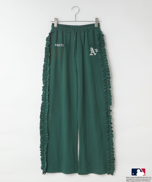 ■デザイン■ 甘さひとさじのスウェットパンツ。 各球団のチームカラーを纏い、刺繍デザインがポイントのスウェットパンツです。 サイドにフリルをあしらうことでスポーティの中にさりげない甘さで“カワイイ”要素をプラスしました。 程よくゆとりのあるストレートシルエットで抜け感のあるアイテムです。 観戦コーデやデイリーコーデにアクセントをプラスしてくれるので、周りと差が付くおしゃれなスポーティコーデを楽しんでいただけます。