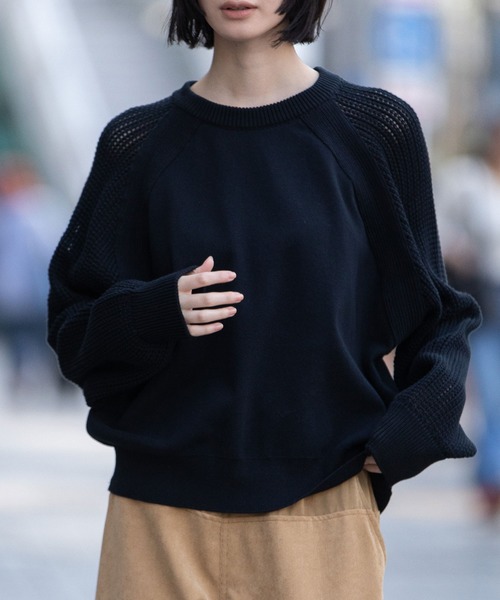 □ 2025 AUTUMN & WINTER COLLECTION □ ◆14GGゴム地編みと7GG透かし編みをドッキングさせた大人カジュアルなニットトップス◆<MATERIAL>オーソドックスなコットンのコーマ糸ですが、天然有機系のデオドラント加工を施された糸で、シーズン問わず快適に着用出来る素材です。ボディーの編地は14GGのゴム地を度詰め気味に編み立てることで、天然繊維ならではの柔らかな風合いに、ナチュラルな張り感を加えています。ニット特有のダレ感がないので、体のラインを拾わず、大人でもストレスなく、着心地良く着られる編地に仕上げています。袖の編地は7GGの透かし編み。ざっくりとしたニットの風合いを残しつつ、シャープで隙間の狭いメッシュ柄に編み立てる事で、ほっこりとした雰囲気を出さずにトレンドの透け感も楽しめる編地に仕上げています。<DESIGN>スウェットのような雰囲気に大人っぽさが加わったニットプルオーバー。すっきりとしたボディーの編地に対して、ざっくりとした柄が目を惹く透かし編みの袖、ラグランラインには片畦テープを施し、オリジナリティーあるデザインに仕上げたニットトップス。透かし編みから素肌がチラリとのぞく感じが、ヘルシーな女性らしさを演出し、スウェット感覚でラフに着られますが、どこか上品な印象にも見えるバランスに仕上げているのがポイント。細すぎず緩すぎずなサイズ感で、どんなボトムに合わせてもしっくり決まるデイリー使いしやすいアイテムです。<COLOR>■ブラック: ベーシックな深みのある黒で、シャープで洗練された印象■グレー:明るすぎず暗すぎない絶妙なグレーで、落ち着いたニュートラルな印象■グリーン:自然を感じさせる深みのあるグリーンでナチュラルで優しい印象■イエロー:柔らかな淡い黄色で、顔周りを明るく見せる効果もあります※光のあたり具合いやパソコンなどのモニター環境によって実際の色味と異なって見える場合がございますので、予めご了承ください。※着用商品はサンプルです。サイズ等の仕様に若干の変更がある場合がございますので、予めご了承ください。※お取扱いについては、商品についております品質表示、アテンションタグにてご確認ください。洗濯:手洗い可.............................≪INFORMATION ≫............................▼商品のお気に入り登録▼『♡』マークを押してお気に入り登録して頂いた商品は、セール開催の通知やクーポン発行などのキャンペーンなど、お得な情報をいち早く受けとる事が出来ますので、ぜひご登録ください。