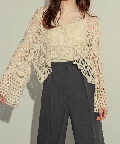 【お気に入り登録者数20,000人突破!!】 フレアスリーブクロシェカーデ レース風クロシェ編みが上品かつ アンニュイな雰囲気の漂うカーディガン。 ボリュームのある袖がデザインのアクセントに!!! 表情豊かなフレアスリーブデザインで1枚着るだけで こなれ感のあるコーディネートが完成!!! キャミソールなどに合わせていただくだけで こなれ感のあるコーディネートが完成します! ≪リアルタイムで情報をチェックしたい方はこちら!≫ 【Instagram/Threads】@neuna_official ■point ・シワになりにくい生地感 ・素肌の上に着てもちくちくしない ・リボン付きで脱ぎ着楽々 ・1枚で存在感のあるデザイン ・どんなシンプルなボトムスとも合わせやすい ・トレンドのフレアスリーブデザイン ・レース風のかぎ編みデザイン! ■detail 柔らかく、大人の女性らしさのある印象を与える black,beigeの2色展開! どちらのカラーも大人の女性らしい透け感を楽しめる 落ち着きのあるカラーとなっております。 ■fabric 夏から秋にかけて、季節の変わり目にぴったり! 透け感とデザイン性を兼ね備えたアイテムなので、 1枚羽織るだけで鮮度のあるコーディネートが完成します。 カーディガンは小さく折りたたんで、 冷房対策としてもおすすめのアイテムです。 …………………… 透け感:あり 厚さ:薄い 伸縮性:なし 裏地:なし リボン:フロント部分にあり …………………… ■coordinate カーディガンはフロントリボンで結んでも、 結ばなくても着用可能! カジュアルに合わせるなら、、、 デニムやスラックスなどと合わせていただくのがおすすめ。 シンプルなスラックスなどと合わせていただくと綺麗めな印象に。 デニムに合わせていただいても トレンド感のあるコーデに仕上がります! フェミニンに合わせるなら、、、 トレンドのシンプルなタイトスカートや デニムスカートなどと合わせるのがおすすめ。 トップスにデザイン性があるためどんなボトムスと合わせても◎ ≡ 《お気に入り登録》でお得な情報がいっぱい ≡ ・「商品のお気に入り登録」で再入荷通知や、 ラスト1点の通知、セール通知も受け取ることができます。 ・「ブランドのお気に入り登録」で新商品や再入荷など、 お得な情報を受け取ることができます! ≡ NÉUNA 公式 SNS ≡ 公式SNSではstaff snapも掲載しております。 是非参考にしてみてください♪ 【Instagram/Threads】@neuna_official 【Tik Tok】@neunaofficial ※詳しいお手入れ方法はアイテムに付属している 表示タグをご参照ください。 ※ご覧のモニター環境により、画像の色味と 多少異なる場合がございます。 ※ご注文いただいた予約商品のお届け時期の確認は、 注文履歴ページより行えます。 ※検品による遅延等を受ける可能性が稀にございます。