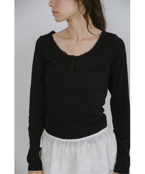 レースが映える、コンパクトなヘンリーネック■デザインヘンリーネックに繊細なレースをあしらった、程よくコンパクトなロングスリーブトップス襟ぐりのレースがさりげないアクセントとなり、シンプルながら女性らしさを引き立てるデザイン■素材感綿95%にポリウレタン5%を混紡した、柔らかく伸縮性のある素材快適なフィット感と動きやすさを兼ね備え、長時間の着用もストレスフリー■スタイリング一枚でデニムやスカートと合わせれば、カジュアルながらも女性らしい印象にキャミソールやビスチェ、ジャケットのインナーとしても活躍しシーズンレスでコーディネートの幅を広げるアイテム---------------------------------透け感:なし裏地:なし伸縮性:あり光沢感:なし生地の厚さ:普通---------------------------------※詳しいお手入れ方法は商品タグをご参照ください。「duei / デュイ」"sensual, mode, daily, mix"しなやかさと自由なニュアンスをセンシュアルな要素をプラスして日常を飾り立てる気分が高まる洗礼された自分らしさを表現できる服を提案します【商品のお気に入り登録】完売カラーの再入荷通知やラスト1点の通知プライスダウンの通知も受け取ることができます。ぜひご登録ください◎【ブランドのお気に入り登録】新商品や再入荷など、ブランドの情報をいち早くお知らせします!ぜひご登録ください◎※ATTENTION※・屋外の光や照明の当たり具合で、実際の商品の色味と カラー別画像の色味に若干の違いが発生する場合がございます。・詳細画像と併せてご確認の上、ご注文いただきますようお願い致します。