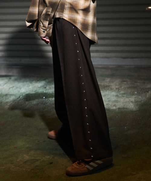 Casper John 2025 Autumn and Winter Collection crawl up from UNDERGROUND 【Hot fit rivet slacks/ホットフィットリベットスラックス】 通年使えるベーシックなスラックス生地を使用 一見シンプルなストレートシルエットながら ヒップを大きめに設計しており見た目以上に快適な履き心地を実現 サイドに熱圧着したリベットディテールと キレイ目なカラー展開のアンマッチが魅力の使い勝手抜群のデザインパンツです。 《BRAND CONCEPT》 CREATIVE / MODE / URBAN をコンセプトに、 トレンドに敏感な都会人、 常に新しいファッションを求める方に、 遊び心を追及した創造性の高いモードスタイルを提案する。