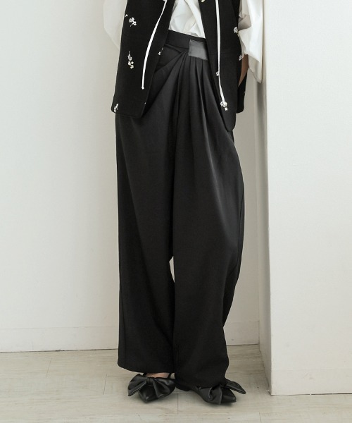 ドレープパンツ■商品説明エレガントなドレープが目を引く、立体的なシルエットが華やかでモード感漂うドレープパンツ。大胆に寄せられたアシンメトリーなタックとドレープデザインが、立体感と動きを演出します。ワイドなシルエットと絶妙な落ち感が、歩くたびに美しいラインが生まれ1枚で主役級の存在感。さらりとした肌触りの上質な素材を使用し、快適な着心地と美しいラインを両立。シンプルなトップスを合わせるだけでスタイリングがアップデートできます。オン・オフ問わず着用できる、ワードローブに加えたい1本です。■生地感透け感:アイボリーのみやや有、裏地:なし、生地の厚さ:普通、伸縮性:なし、ポケット:1■サイズ(cm)【OneSize】[ショート丈]ウエスト 約35-40、ヒップ 約54、わたり 約42、股上 約40、股下 約59.5、裾幅 約25、総丈 約93.5[ロング丈]ウエスト 約35-40、ヒップ 約54、わたり 約42、股上 約40、股下 約65.5、裾幅 約25、総丈 約98.5※平置き採寸のため若干のブレがございます。~*~*~*~*~*~*~*~*~*~*~*~*~*~*▼ 商品のお気に入り登録 ▼完売カラーの再入荷通知や、ラスト1点の通知、セールの通知も受け取ることができます。ぜひご登録ください♪▼ ブランドのお気に入り登録 ▼新商品や再入荷など、ブランドのお得な情報をいち早くお知らせ!ぜひご登録ください♪