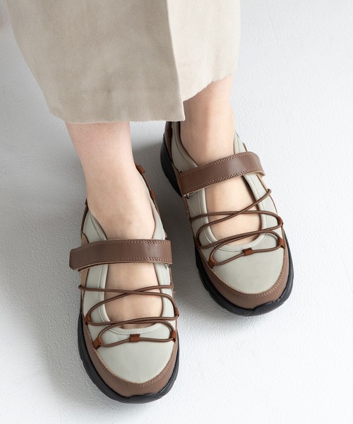 トレンド継続中のストラップデザインのスニーカー。甲の部分が開いているデザインは夏にもぴったりです。 アッパーは異素材とカラーをミックスしたこだわりのカラーバリエーション。 ボリュームがありながらも軽量のソールで履き心地も◎です。 足首ベルトはベルクロタイプで簡単に調節が可能。 夏のレジャーや沢山歩く日にもおすすめです。 ※撮影は室内で行われており、ライティングにより実物と色味が少し異なる場合がございます。