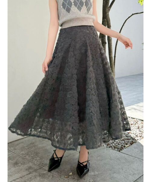 【商品】チュールにお花のモチーフを全面に施した、圧倒的な存在感と高級感を放つフレアスカート。ヒップから腰回りをカバーしながら裾にかけて構築的なボリュームシルエットを形成。華やかな立体感を出しながら、スタイル良く見えるように仕上げました。【スタイリング】綺麗めなニット合わせでレディなコーデはもちろん、今季はスウェットやジャケットのアウト合わせでヘルシーに見せると、よりトレンドライクなスタイリングに昇華します。【 お買いものにおすすめの便利機能! 】★商品のお気に入り登録完売カラーの再入荷時や、ラスト1点の時、セール開始時にお知らせします。★ブランドのお気に入り登録新商品や再入荷、セール情報など、いち早くブランドのお得な情報を受け取ることができます。ぜひご活用ください。※実際にお届けする商品と仕様やサイズが異なる場合がございます。また生産の都合上、お届け時期が前後する場合がございます。