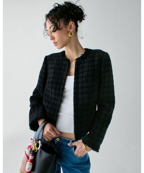 ツイードが持つクラシックで上品な雰囲気を楽しみつつ、かっちりしすぎないソフトな着心地も兼ね備えるプラザツイードで仕立てたノーカラージャケット。袖口にあしらったファセットカットのスペードフラワーモチーフがシックに煌めきます。 【商品詳細】 ・ドライクリーニングのみ