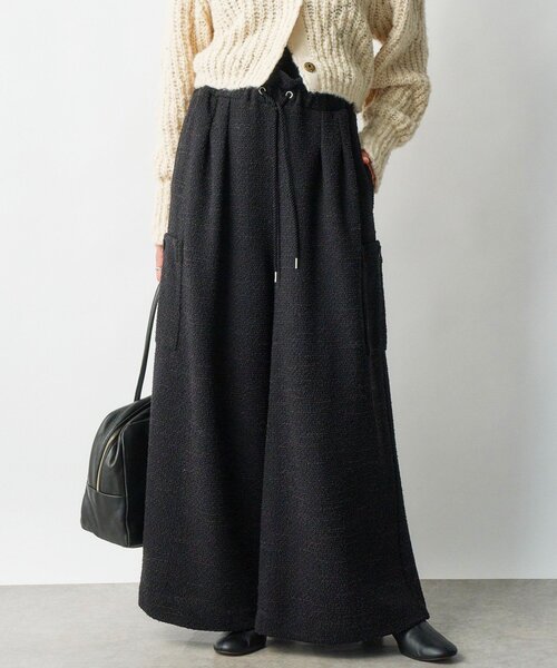 表面感がお洒落なカットツイード素材が魅力●デザイン・しなやかさとボリューム感を併せ持つカットツイードを使用・ロープ風のコードとフリル風ウエストが着こなしのアクセントになるデザイン・たっぷりしたフレアシルエット+マキシ丈で、スカート風な見え方なのもポイント・サイドポケットをあしらい、カジュアルなムードもプラス・膝下までの裏地付き・総ゴム+ドロストのイージーな着心地も魅力●素材《表地》ポリエステル 89% 綿 8% レーヨン 3%《裏地》ポリエステル 100%・モコモコした表面感のあるカットツイード素材洗濯方法:手洗い可透け感:なし裏地:あり伸縮性:なし生地の厚さ:-光沢:なしファスナー:なしポケット:あり--------------------------------------------------------------------------------【お買い物をもっと便利に楽しく♪】『♡』をクリックでお気に入り登録✓「商品のお気に入り登録」で・・・ラスト1点や再入荷の通知が届きます。登録して頂いた商品だけが対象となる、あなただけのタイムセールが開催されることも!✓「ブランドのお気に入り登録」で・・・新商品や再入荷など、いち早くブランドのお得な情報を受け取ることができますので、ご登録をおすすめします!--------------------------------------------------------------------------------【注意点】※画像の商品は光の照射や角度、お使いのモニター環境により、 実物と色味が異なる場合がございます。※入荷状況により、お届け予定が前後する場合があります。※お客様への発送が店頭販売より遅れる場合もあります。※追加生産商品は、一部の店舗、通販で販売中の場合がございます。 予めご了承下さい。----------------------------------------------------------------------