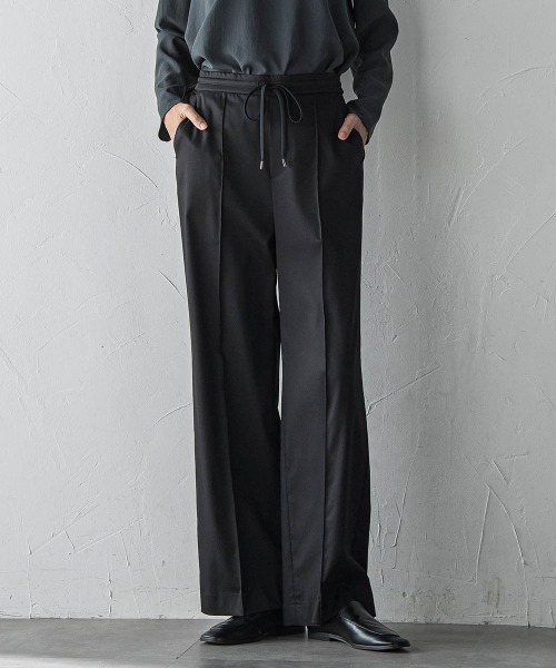 【デザインの特徴】テンセル・ナイロンにポリウレタンをブレンドしたデニム見えシャンブレー素材で仕立てた、きれいめワイドパンツ。センターにピンタックを施し、脚をすっきりと長く見せる効果をプラス。ウエストは総ゴム仕様で快適ながら、前見頃はギャザーを寄せないフラット設計にしているため、フロントラインはシャープで美しい仕上がり。伸縮性もあり、動きやすくデイリーに心地よくはける一本です。カットソーからブラウスまで幅広く合わせやすく、大人のカジュアルスタイルにぴったりの逸品です。【機能性】◆Easy Careご自宅でのお手入れが簡単◆接触冷感【素材の特徴】緯ナイロンの素材でリヨセルの落ち感と緯ナイロンの締まり感が合わさった素材です。落ち感ありつつ清涼感もあるこの素材は暑いSSにはもってこいの素材です。----------------------------------------------------------------洗濯方法家庭洗濯:液温は30℃を限度とし、洗濯機で非常に弱い洗濯ができる。自然乾燥:日陰の吊り干しがよい。アイロン:底面温度120℃を限度としてアイロン仕上げができる。ドライクリーニング:石油系溶剤による弱いドライクリーニングができる。----------------------------------------------------------------※画像の商品はサンプルとなりますので実際の商品と仕様、加工、サイズが若干異なる場合がございます。※お客様のモニター環境により実際のお色と多少異なる場合がございます。※撮影状況や光の当たり具合により、色合いが異なって見える場合がございます。※商品タグに記載されたサイズはヌードサイズです。実際の商品のサイズは商品情報の実寸をご確認ください。--------------------------------------------------------------------▼商品のお気に入り登録ハートマークをクリックし、お好きなカラーを選んでお気に入りに登録完売カラーの再入荷通知や、ラスト1点の通知、セールの通知も受け取ることができます。▼ブランドのお気に入り登録新商品や再入荷等、いち早くブランドのお得な情報を受け取ることができます。 --------------------------------------------------------------------