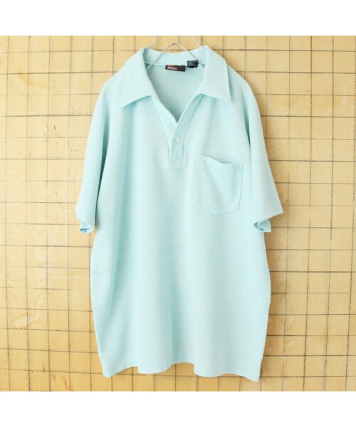70s 80s USA ROBERT BRUCE ポリニット オープンカラーポロシャツ メンズXL ライトブルー 半袖 アメリカ古着です。 70年代から80年代頃のROBERT BRUCEポロシャツです。 ボディは柔らかく軽い肌触りのポリエステル生地です。 カラーはライトブルー、襟はオープンカラーです。 メンズXLです。 詳細サイズにてご確認ください。 当店にてクリーニング済みです。 【表記サイズ】 XL 【素材】 ポリエステル 100% 【採寸サイズ】*袖丈は首周りから袖口までを採寸しています。 身幅:58.5cm 着丈:68cm 袖丈:37.5cm
