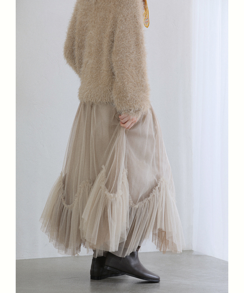 【2025AW】 La Totalite 繊細なチュールとドラマティックなランダムヘムが、着こなしに華やかさを添える1着。 程よいボリューム感と軽やかな素材が動くたびに揺れ、女性らしさを引き立てます。 ウエストは総ゴム仕様でストレスフリーな着心地。 裏表の2WAY仕様でその日の気分に合わせて雰囲気の変化も楽しめます◎ カジュアルなニット合わせはもちろん、きれいめブラウスとのスタイリングもおすすめ。 季節を問わず、オールシーズン活躍する万能アイテムです。 ********************** 透け感:なし 裏地:なし(ペチコート付き) 伸縮性:なし 光沢感:なし 生地の厚さ:普通 ********************** 【スタッフ着用コメント】 《スタッフ名:mizuki》 身長:160cm/体型:普通/普段サイズ:S~M/着用サイズ:フリー サイズ感:くるぶしが隠れる程の着丈があります。ウエストはゴム仕様でジャストサイズです。 素材感:ふんわりと軽く、柔らかなチュール素材です。 着心地:ウエストゴムなので楽な着心地が魅力です。生地をたっぷりと使用していますが重たさは感じませんでした。 ********************** ※取り扱いについては、商品についている品質表示でご確認ください。 ※照明の関係により、実際よりも色味が違って見える場合があります。 またパソコン・スマートフォンなどの環境により、若干製品と画像のカラーが異なる場合もございます。 ※商品の色味は、商品アップ画像をご参照ください。 着用モデル身長:164cm 着用サイズ:フリー スカート:手洗い可能, ペチコート:洗濯機洗い可能