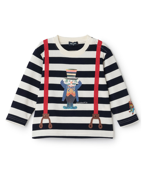 サスペンダーのようなデザインで個性的に仕上げた長袖Tシャツです。ベルト部分の配色がおしゃれなアクセント。フロントにはサーカスの団長さんをプリントしました。ピアニカを吹くアライグマの刺しゅうも可愛さあふれるポイント。内側にお名前を記入できるタグがついています。※80、90サイズのみ肩開き【透け感】やや透ける【生地の厚さ】普通【伸縮性】あり【裏地】なし【ポケット】なし