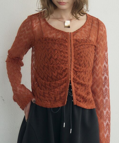 <秋カラーで今から楽しめる◎>▼デザイン・透け感のあるレース素材・フロントはホック仕様・コンパクトめの丈感・ぴたっとしすぎないサイジング▼コーディネート・残暑厳しい晩夏初秋におすすめのアイテム・ホックは下部を数個あけて着用頂くと抜け感が出て◎・ややコンパクトなシルエットなのでボトムはボリュームのあるものやワイド目なデザインが相性よいです------------------------------生地感:薄手伸縮性:なし透け感:あり裏地:なし------------------------------▼ブランド紹介kivi (キヴィ)シンプルだけど、時にエッジを効かせ、「大人のかわいい」の実現へ。自分を磨き、大切にできるニューノーマルを生き抜く全ての女性へ。#kivi #2025aw #レース #レースカーデ#レーストップス #すかしカーデ #シアー▼注意事項※撮影環境やモニター環境によって実際の商品とお色味が多少異なってみえる場合がございます。品番:KF580011T001 / 品名:透かしカットカーデ