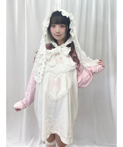 ビターな夜に、キャンディみたいな甘さをひとつ。胸に光る羽根は、孤独を飾るアクセサリー。黒は少し切なくて、ピンクはどこか無邪気で。その狭間で揺れる気持ちを、そっと包み込むロンT。寂しさも、かわいさも、どちらもわたしの一部だから。各安全ピン取り外し可