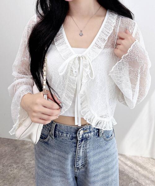 【繊細な総レースがエレガントなロングスリーブカーディガン】 フロントはリボンで結ぶボレロ風デザインで着やすくなっています。 襟元や裾部分のフリルが表情をプラス。 透け感のあるレースは合わせるインナー次第で様々な着こなしを楽しめます。 短めの裾丈で好バランスのコーディネイトが完成。 上品なアイテムなのでオンオフ問わずに着まわせます。 【以下モカ参考。カラーにより多少の誤差あり】 ・透け感:透ける ・伸縮性:あり ・生地の厚さ:薄め ・裏地:なし