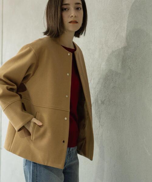 上品なシャンパンゴールドのドットボタンがポイント。 シーンを問わず活躍するノーカラーコート 【デザイン】 ・シンプルでありながらも、計算された上品なシルエットが魅力のノーカラーショートコート。 ・きれいめスタイルはもちろん、ややボクシーなシルエットでカジュアルな着こなしもかないます ・シャンパンゴールドのドット釦を使用し、開けて着用した時も上品な印象に仕上げています。 【素材】 ・ふくらみのある柔らかなウール調のジャージ素材を使用 ・ニードルパンチ加工を施し、圧縮ウールのようなふくらみとマットな質感を表現。 ・アウターでありながら、ご家庭でお手入れ可能なマシンウォッシャブルもポイントです。 【仕様】 ・ポケット数:横×2 ・裏地あり ・前スナップボタン ※照明の関係により、実際よりも色味が違って見える場合があります。また、パソコン・スマートフォンなどの環境により、若干製品と画像のカラーが異なる場合もございます。 モデル情報:身長165cm B72 W57 H84 着用サイズ:38(M) 店舗へのお問い合わせ商品番号:637-91001 ●製品寸法: 36(S):着丈61cm B98cm 袖丈52cm 肩幅46cm 38(M):着丈62cm B101cm 袖丈53cm 肩幅47cm 40(L):着丈64cm B104cm 袖丈54cm 肩幅48cm 42(LL):着丈64cm B107cm 袖丈55cm 肩幅49cm 備考:重量:約650g(サンプルサイズ)