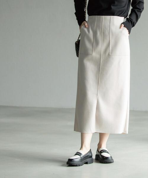 ウール調のニードルジャージ素材を使用した、美シルエットの大人気タイトスカート【デザイン】・すっきりとしたバランスで穿ける、Iラインのシンプルなタイトスカート。・フロントやポケット部分に入ったステッチデザインがアクセント。・細見えが叶うウエストデザインながら、後ろはゴム仕様で楽に着ていただけます。・フロント裾スリットで、足さばきも快適です。【素材】・ふくらみのある、柔らかなウール調のジャージ素材を使用。・ニードルパンチ加工を施した、圧縮ウールのようなふくらみとマットな質感がポイント。・きちんと感がありながら楽に着られる着心地の素材です。・マシンウォッシャブルでご自宅でのお洗濯も可能。【仕様】・ポケット数:横×2・左脇ファスナー・ウエスト後ろゴム・裏地あり※照明の関係により、実際よりも色味が違って見える場合があります。また、パソコン・スマートフォンなどの環境により、若干製品と画像のカラーが異なる場合もございます。モデル情報:身長165cm B72 W57 H84 着用サイズ:38(M)店舗へのお問い合わせ商品番号:637-71005●製品寸法:36(S):総丈85cm W67cm H96cm38(M):総丈86cm W70cm H99cm40(L):総丈88cm W73cm H102cm42(LL):総丈88cm W76cm H105cm備考: