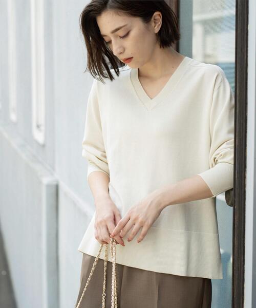 すっきり着られるVネックラインのニット【デザイン】・肩ラインのデザイン切り替えがポイントになっているラグランスリーブニットです。・ゆとりあるシルエットと深めのVネックが抜け感のある着こなしに仕上がります。・後ろネックにつけたオリジナルプレートとリンキングが、後ろ姿も素敵なワンポイントデザインに。・タイトシルエットのスカートやデザインパンツなど、幅広いアイテムとのスタイリングが楽しめるシンプルさも◎【素材】・ヴィスコース(レーヨン)とウール混防の、上品な光沢ときれいな表面感が特徴の14ゲージのハイゲージニットを使用。・マシンウォッシャブルでご自宅でのお洗濯も可能。※照明の関係により、実際よりも色味が違って見える場合があります。また、パソコン・スマートフォンなどの環境により、若干製品と画像のカラーが異なる場合もございます。モデル情報:身長163cm B82 W62 H91 着用サイズ:38(M)店舗へのお問い合わせ商品番号:637-14011●製品寸法:38(M):着丈62cm B112cm 袖丈68cm 肩幅42cm40(L):着丈64cm B116cm 袖丈69cm 肩幅44cm42(LL):着丈66cm B120cm 袖丈70cm 肩幅46cm備考: