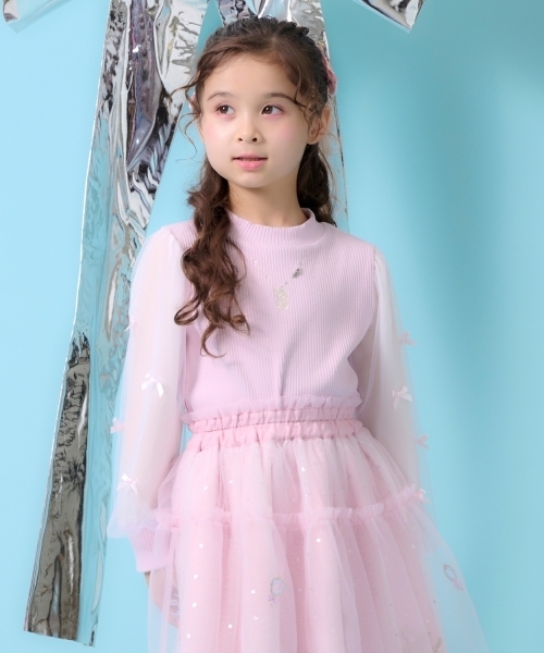 女の子らしい要素を詰め込んだ長袖Tシャツです。 トゥシューズをモチーフにした、ネックレス風の刺しゅうに心惹かれます。 シアー感のある袖には、可愛いミニリボンをプラス。 パステルカラーでデザインしており、やさしい雰囲気がただよいます。 内側にお名前を記入できるタグつき。 【透け感】透けない 【生地の厚さ】普通 【伸縮性】あり 【裏地】なし 【ポケット】なし
