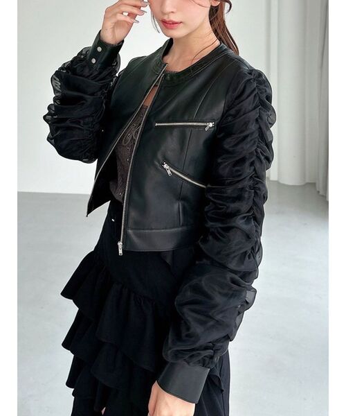 シアースリーブとギャザーがポイントのブルゾン ▽デザイン▽ 合皮を使用したクールな印象漂うブルゾンですが、 ノーカラーや袖のシアー素材、たっぷりと寄せたギャザースリーブで 女性らしさをプラスさせたバランスの良い1枚。 ジップデザインがクールな印象をプラス。 サラッと羽織るだけで上半身をコンパクトに見せスタイルアップが叶います。 ▽カラー▽ 白・黒・チャコールグレーの3色展開。 ▽スタイリング▽ クロップド丈なのでワンピースやハイウエストボトムとの相性抜群! 秋や春の季節の変わり目にピッタリのアウターです◎