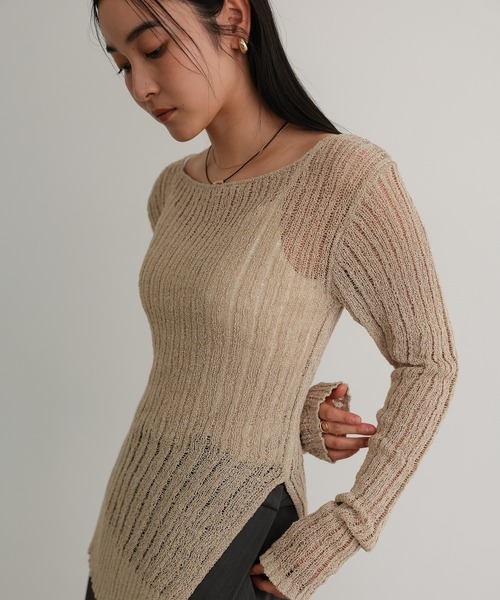 アシメヘムでエッジを効かせたニュアンスシアーニット ■Design 表情のある針抜きリブのさりげないシアー感がポイントのニット。 アシンメトリーな裾が動きを演出し、着るだけでこなれた印象に。 前と後ろの衿下がりを変えており、前後2WAY仕様にしております。 どちらを前にしても着用可能ですので、その日の気分でスタイリングをお楽しみいただけます。 ■Material ループ状の糸が編みこまれた、表面感のある糸を使用。 編み地を針抜きリブにする事で透け感を出し、暑さが残る季節にも着用していただける様に仕上げました。 -------------------------------------------- 洗濯方法:手洗い 裏地:なし 透け感:あり(編み地) 伸縮性:あり 厚さ:普通 -------------------------------------------- 【TENTO/テント】 年齢やシーンにとらわれず自由なコンビネーションで自分らしいファッションを楽しむ大人の女性のためのワードローブを提案。 都会的でありながら、一点もののビンテージのように愛着のわくディティールにこだわったブランド。