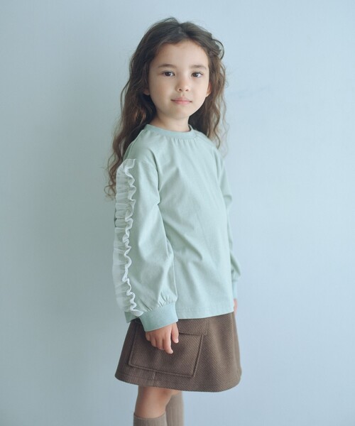 チュールのフリルが目を引くプルオーバー■デザイン袖のチュールフリルが目を引く長袖Tシャツ。フェミニンなチュールの雰囲気と、少しオーバーなシルエットが、甘辛な大人っぽい仕上がりです。100cmから160cmまでの幅広いサイズ対応が可能♪兄弟姉妹、お友達とペア、リンクコーデ、お揃いコーディネートを楽しめるアイテムです。■素材天竺、袖フリルはチュール素材。■コーディネートジャンスカやオーバーオールなどのインナーにしていただくと、袖のデザインが目立ってGOOD◎。シンプルにデニム合わせもおすすめです。============================裏地:なし透け感:なし伸縮:ややあり光沢感:なしケア方法:洗濯機洗い可============================【注意事項】※商品に「取り扱い上の注意書き」、「洗濯表示」がございます場合は、使用前に必ずご確認ください。※商品画像は、光の当たり具合やパソコンなどの閲覧環境により、実際の色味と異なって見える場合がございます。あらかじめご了承ください。※商品の色味の目安は、商品単体の画像をご参照ください。店舗へお問い合わせの際は、全国のgreen label relaxing各店舗まで下記の品名/品番をお申し付けください。品名:◎◆ソデフリルT 品番:38121992041
