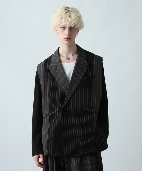 ーーー セットアップ対応 異なる3枚の生地を掛け合わせて再構築したような遊び心のあるデザイン 細かめのストライプ柄やチェック柄を採用した綺麗な印象のデザインベスト ーーー DESIGN 異なる3種類の生地をカットオフデザインでつなぎ合わせ、再構築したように見えるヴィンテージライクなデザイン。 ブラック系その他は幅の細いストライプ柄や、落ち着いたトーンで主張しすぎないラメを織り込んだストライプ柄を選定しており、総柄ですが取り入れやすい一枚。 ブラウン系その他は細かめなグレンチェックを採用することで、トレンド感をプラスさせ、上品な印象に。 身幅を広くしておりリラックスして着用できますが、襟を付ける事でラフになりすぎず上品で綺麗な印象に仕上げました。 MATERIAL ポリエステルとレーヨン、ポリウレタンを混紡した生地で、薄手の生地を選定しており夏も羽織りやすくて〇 ポリエステルとレーヨンを掛け合わせたTR素材はしなやかで上品な表面感が魅力。肌触りもよくシワになりづらいためお手入れも簡単〇 ポリウレタンを混紡する事で伸縮性が高まるため着心地抜群に。 SET ITEM セットアップ対応アイテムはコチラ→【234708】 ※カットオフになっており仕様上、糸が垂れております。
