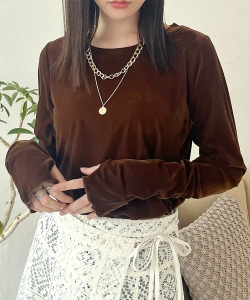 大人かわいい透け感ベロアの長袖トップス♪ 柔らかなシアーベロアの素材のサムホール付きトップス。 柔らかな光沢とムラ感のあるベロア素材は、動くたびに揺れるニュアンスが女性らしさを演出してくれます。 ボディラインを拾いすぎず程よいフィット感や長めの袖丈に指開きのデザインですっきりとした印象に。※ブラックのベロアは生地の特性上色落ちの可能性がございますので、色移りしやすい薄い色と合わせての着用はお控えください。 また、色移り防止のため最初の2~3回は単体での洗濯をお願いいたします。 ■point・控えめな透け感のシアー素材 ・秋冬のシーズンムードが高まるベロア生地! ・肌触りがよくストレスフリーな着心地 ・指抜きロングスリーブが手先やネイルを綺麗見せ♪ ・インナーとしてもトップスとしても◎ ・シンプルな無地で着回しやすい! ・すっきり着られるクルーネックタイプ ・オールシーズン着回せる万能アイテム ■styling ・秋にはトップスとして1枚での着用がおすすめ。ベロアの光沢感とひかえめなシアー感がシンプルながらもこなれた印象に。 ・デニムで大人カジュアルに、スラックスできれいめに、スカートでフェミニンに、様々なテイストにマッチします。 ・ジャンスカやキャミワンピ、サロペットやVネックベストのインナーとしても大活躍! ・1枚で秋から冬、春までロングシーズン着用出来るすぐれもの♪ 【裏地】なし 【透け感】ややあり 【伸縮性】ややあり ◆注意事項 ※撮影時のライティングや撮影場所により実際の商品と色味が異なって見える場合がございます。