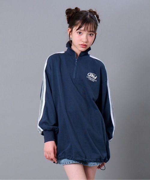 ハーフジップがスタイリッシュに見せてくれるチュニックです。大胆な配色ラインで、スポーティー感あふれる一枚に仕上げました。胸元のロゴ刺しゅうも目を引くポイント。丈が短いボトムを合わせると、ワンピース風のコーデが完成します。【透け感】透けない【生地の厚さ】普通【伸縮性】あり【裏地】なし【ポケット】あり【アジャスター】なし