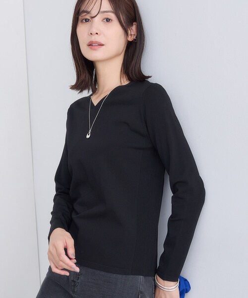 【デザインポイント】さらっとした質感がシーズン長く着ていただける合繊プルオーバーです。シンプルなVネックプルオーバー。縦長の計算された衿ラインは、ジャケットを羽織ってもネックラインをすっきりと綺麗に見せてくれます。ジャケットのインナーとしても綺麗に着ていただける様に、肩まわりや袖のサイズ感にも拘りました。袖下と身頃脇に縦柄を入れてさりげないディティールをプラス。シンプルにミニマムに、仕立てに拘ったVネックプルオーバーです。【スタイリングポイント】シンプルな定番的なインナーですので、デザインボトムや柄ボトムとのスタイリングや、アウターやジャケットのインナーに幅広く着回していただけるのが魅力です。【素材ポイント】ビスコースフィラメントのダルタイプを使用したストレッチヤーンです。光沢の無いマットな表情とサラリとした爽やかな風合いが特徴です。ストレッチのポリエステルはELITEを使用しており、形状安定性と弾力性によりストレスフリーな着心地を備えています。※照明の関係により、実際よりも色味が違って見える場合があります。また、パソコン・スマートフォンなどの環境により、若干製品と画像のカラーが異なる場合もございます。モデル情報:身長170cm B74 W60 H86 着用サイズ:38(M)店舗へのお問い合わせ商品番号:127-14954●製品寸法:05(XXS):着丈55cm B80cm 袖丈52cm 肩幅34cm13(LL):着丈61cm B96cm 袖丈57cm 肩幅38cm15(3L):着丈62cm B102cm 袖丈58cm 肩幅39cm34(S):着丈58cm B84cm 袖丈56cm 肩幅35cm38(M):着丈59cm B88cm 袖丈57cm 肩幅36cm備考: