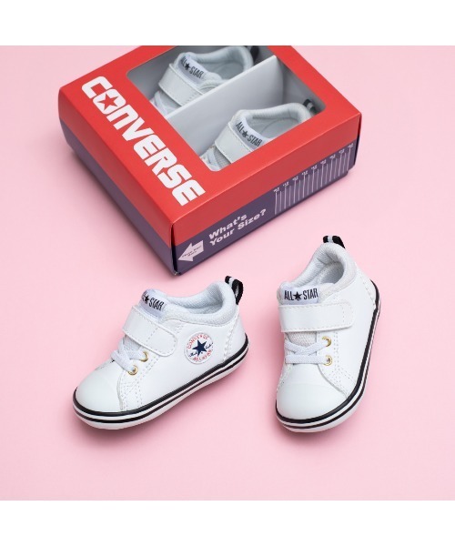 ミニオールスター N V-1のカラーアレンジモデル。シンプルで様々なコーディネートに合わせやすいシンセティックモデル。好評のホワイトベースに、ゴールドのアイレットを採用。しなやかなラバーを採用し足の曲がる位置でしっかり屈曲する足に優しい仕様。踵にフィットしやすいよう履き口にパッドを使用。ベルトタイプで脱ぎ履きしやすいデザイン。プレゼントに最適なサイズチェッカーがプリントされたギフトボックス仕様。カラーはホワイト/ゴールドの1カラー展開。