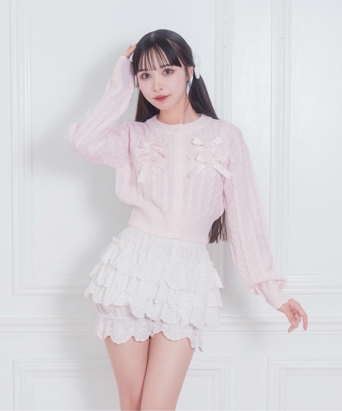 シンプルで使いやすいケーブルカーディガン♩胸元のリボンでガーリーさもあるアイテムです❤︎コンパクトな丈感なのでワンピースやハイウエストなアイテムとのコーディネートがおすすめです◎