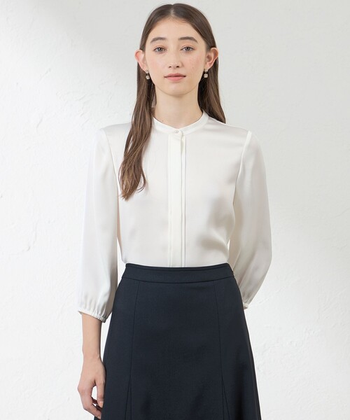 さりげない上品さで日常使いしていただきやすいフロントタックブラウス【デザイン】フロントにタックを施し、比翼仕立てのシンプルなブラウスです。第一ボタンにパールボタンをあしらい上品な印象で着用いただけます。。ジャケットINにも着やすいシンプルで美しい万能ブラウスです。オケージョンやビジネスにシャークストレッチのジャケット(V5E04605)とスカート(V5S05605)とのコーディネートもおすすめです。カラー展開はナチュラルで柔らかい雰囲気のオフホワイトと洗練された中に柔らかさのあるライトパープル、ベーシックなブラックネイビーの3色展開です。【素材】定番のバックサテンジョーゼットを使用しています。ポリエステルなのでお手入れも楽で、程良い厚み感もあり、体の線を拾いにくいのが特徴です。落ち感もあってとてもきれいな素材となっております。手洗い可能でお手入れしていただきやすいです。