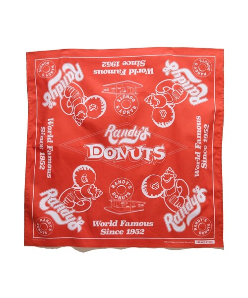2025 Fall & Winter Itemランディーズドーナツは、1952年にロサンゼルスで創業した大人気な老舗ドーナツ店です。米国1号店の屋根上にそびえ立つ巨大なドーナツ型サインが古くから街のシンボルとなっており、人気映画やミュージックビデオなどにも登場するロサンゼルスのランドマークとして広く知られています。2025年5月にはランディーズドーナツ日本初上陸を記念して、国内店舗で販売するオフィシャルアパレルグッズはフリークス ストアが手掛けています。今回はデザイン第二弾のアイテムをランディーズドーナツ渋谷代官山店とフリークス ストア一部の店舗にて同時発売致します。こちらはランディーズドーナツを象徴するオレンジカラーにアイコニックなロゴやアート、メッセージをプリントしたバンダナ。アメカジマストアイテムとして根強い人気です。普段使いのカジュアルファッションにアクセントをもたらします。ロサンゼルスの雰囲気満載なアパレルグッズをぜひお楽しみください。※掲載画像の商品のお色味につきましては、屋外や屋内の光の照射や角度により実物と色味が異なる場合がございます。※着用、お取り扱いの際は、商品についている品質表示とアテンションタグを必ずご確認下さい。