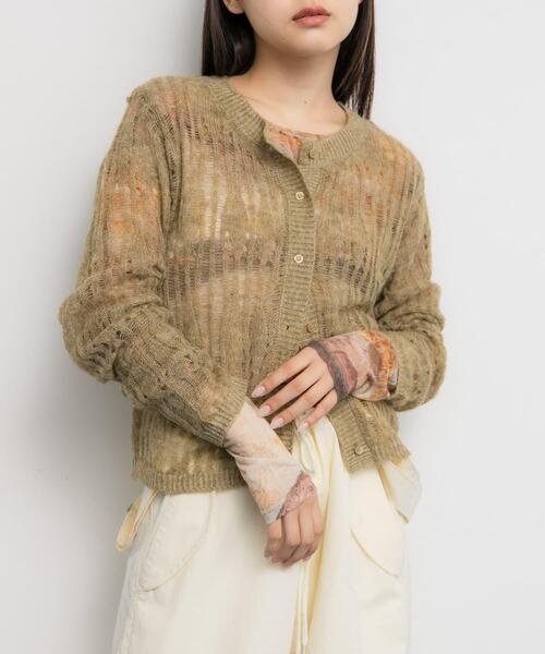 【鮮度UPなスタイリングが期待できるトップス】 メッシュニットとシアーインナーがセットになったトップス。モヘアライクなニットはダメージのような編地がポイントになっており、インナーは柄になっており、ベーシックボトムに合わせるだけで鮮度UPな着こなしが叶います。セット使いはもちろん、別々でも使用いただけるので、着回し力も抜群です。 【2025 Autumn/Winter】【25AW】 ※素材や編み方の性質上、引っ掛け、引っ掛かりが起きやすい性質をもっています。お取り扱いにはご注意ください。 総重量 : 約160g [インナー] one : 肩幅37cm / 総丈55cm / 身幅42cm/ 袖丈62cm ※商品画像は、光の当たり具合やパソコンなどの閲覧環境により、実際の色味と異なって見える場合がございます。予めご了承ください。 ※商品の色味の目安は、商品単体の画像をご参照ください。 ▼お気に入り登録のおすすめ▼ お気に入り登録商品は、マイページにて現在の価格情報や在庫状況の確認が可能です。 お買い物リストの管理に是非ご利用下さい。 素材感 透け感 : あり 伸縮性 : あり 裏地 : なし 光沢 : なし ポケット : なし one