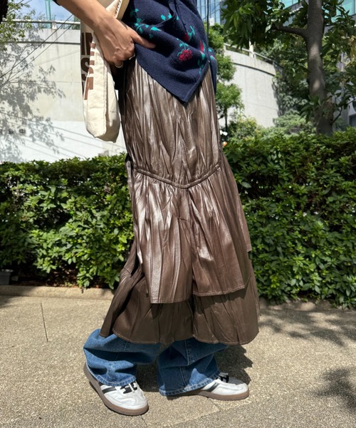 AUTUMN & WINTER ( 秋服 / 冬服 ) ■ポイント この秋冬注目素材のレザーライク素材を使用したスカート。 重たくなりすぎない、軽やかな生地感でオールシーズン着用頂けます。 ■ディテール ランダムなティアード切替で、動きのあるシルエットを表現。 ウエストは周囲ゴム仕様です。 フェイクレザーの艶感のある素材をコーディネートに取り入れると、全体が引き締まりグッとおしゃれに見える事まちがいなし。 ■スタイリング 夏から秋にはカジュアルなTシャツと、冬はニットやスウェットと合わせてミックススタイルをお楽しみいただけます。 ■生地 PUコーティングをしたレザーライク素材。 薄手素材を土台布に使用することにより、軽くしなやかに仕上げました。 素材の特性上、経年劣化によるPU剥離の可能性があります。 ■透け感:なし ■裏 地:なし ■伸縮性:なし ■光沢感:あり [注意事項] ※画像の商品はサンプルです。実際の商品と仕様、加工が若干異なる場合があります。 ※画像の商品は光の照射や角度、お使いのモニター環境により、実物と色味が異なる場合がございます。 ※着用、お取り扱いの際は、アテンションタグをご確認ください。 ※弊社管理上のカラーを表記しており、タグのカラー表記と異なる記載となっている場合がございます。 ▼商品のお気に入り登録お気に入りアイテムの再入荷・在庫1点などの通知を受け取ることができます。 ▼ブランドのお気に入り登録新作アイテムの入荷や人気アイテムの再入荷、おすすめトピックスなど、いち早くブランドの情報を受け取ることができます。 ※こちらの商品は、RODEO CROWNS WIDE BOWL 独自の採寸方法となっています。本サイトのサイズガイドと採寸方法が異なる場合がありますのでご了承ください。