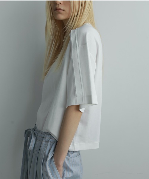 【本体】綿80% ナイロン20% 【別布】ポリエステル100%上品なポンチ素材で仕上げたデザインTシャツ。前振りのショルダーデザインで、カットオフした別布を重ねた切り替えディテールで、モードな印象を纏っていただけます。ワイドなボディとショート丈のバランスが絶妙で、柄ボトムやワイドパンツとも好相性。首周りはスッキリとコンパクトに仕上げ、背面のファスナーでスマートに着脱可能です。シンプルながらも個性が光る一着。