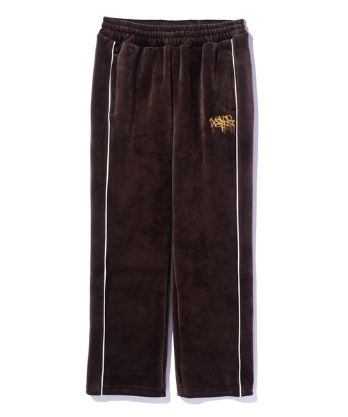 【ディテール】・光沢感のあるベロア素材のパンツ。・左ポケット下のインクを垂らしたようなロゴ刺繍がさりげないポイント。・同じベロア素材のジャケットとセットアップとしても着用可能です。・透け感:なし・裏地:なし・生地の厚さ:普通・伸縮性:あり・シルエット:スタンダード※ウエストゴム仕様。サイズ表【ウエスト】はゴムを伸ばさず平置きした状態です。【取り扱い注意事項】・アテンションタグ・洗濯表示を必ずご確認の上、ご使用下さい。・刺繍部分は大変引っ掛かりやすく、周囲の物との接触や極度の摩擦に十分ご注意ください。・繊維が抜け落ちる恐れがあります。※画像の商品は光の照射や角度により、実物と色味が異なる場合がございます。また表示のサイズ感と実物は若干異なる場合もございますので、予めご了承ください。※商品の色味の目安は、商品単体の画像をご参照ください。※画像の商品はサンプルとなります。実際の商品と色味、仕様、加工、サイズ、素材等が若干異なる場合がございます。※予約商品など一部商品につきましては、生産の都合上、お届け時期が前後する場合がございます。【お気に入り登録のオススメ!】▼商品のお気に入り登録 完売カラーの再入荷通知や、ラスト1点、セールの通知をお知らせします。 ▼お気に入りショップに追加 新商品や再入荷など、いち早くブランドの情報を受け取ることができます。