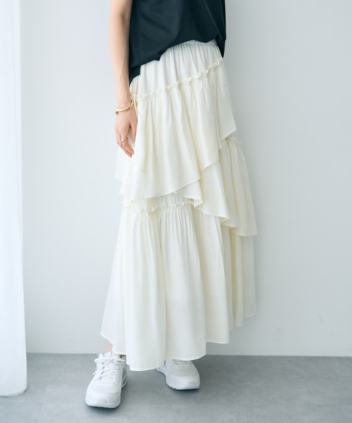 ラッフルが華やかに揺れるフレアスカート。とろみのある滑らかな微光沢素材でフェミニンに仕立てました。ウエストはゴム仕様ではき心地も快適。シックなワントーンカラーでどんなアイテムとも合わせやすく、幅広いスタイリングで活躍してくれるおすすめのアイテムです。透け感[ややあり]生地の厚さ[普通]光沢感[ややあり]伸縮性[なし]裏地[あり]ポケット[なし]-------------------------------------------●YECCA VECCA●(イェッカ ヴェッカ)「大人のハッピーモードな着映え服」毎日を自分らしく、ハッピーに過ごすことにポジティブな女性のためのリアルクローズ。キーワードは「遊び心のある、女性らしいモード服」でも「コンフォート」。都会的で女性らしいムードを大切に着ていて心地よく、気持ちが上向きになるような遊び心のあるデザインウェアをラインナップ。自分自身がわくわく出来る洋服で日常を最大限に楽しむ大人の為のスタイルを提案していきます。▼商品のお気に入り登録がおすすめです ▼商品ページ内のハートマークをクリック。完売時の再入荷や、最後の1点の通知、最後の1点など、お得なお値下げ情報を受けとる事ができます。【お知らせ】ページでも通知が確認できます。-------------------------------------------