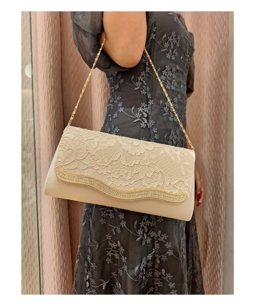 ***結婚式・二次会・謝恩会・成人式・パーティー等のフォーマルシーンにオススメ***結婚式、二次会、謝恩会にぴったりのクラッチバッグ。高級感のあるレースにラインストーンプレートが華やかなデザインです。120cmのチェーン付でショルダーバッグとしても使える2WAYタイプです。