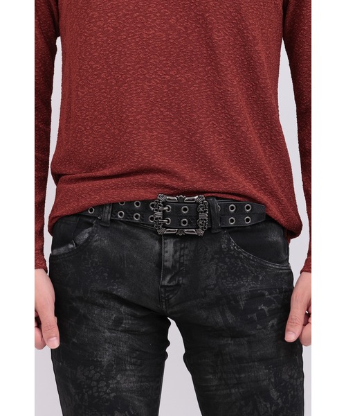 [DESIGN]近年注目の“ダブルピンタイプ”のベルトを、TORNADO MARTらしい解釈でアレンジ。 ダブルピンを「牙(ファング)」に見立てた力強い印象のデザインから、「デュアルファング」と名付けました。フロント全面にハトメを打ち込んだフリーサイズ仕様は、インパクトと実用性を兼備。 ランダムに切り替えた3種の異素材レザーに、ジグザグステッチを効かせてクラフト感をプラス。素材の表情を活かしたワイルドで存在感のある1本に仕上げています。[TEXTURE]牛革スムース・牛革シュリンク・蛇革の3種のレザーを使用。それぞれの質感が生むコントラストが、立体的で奥行きある表情を引き立てます。※天然の皮革を使用しているため、摩擦や水濡れにより色落ちすることがあります。雨天でのご使用や淡色の衣類を着用の際は特にご注意下さい。