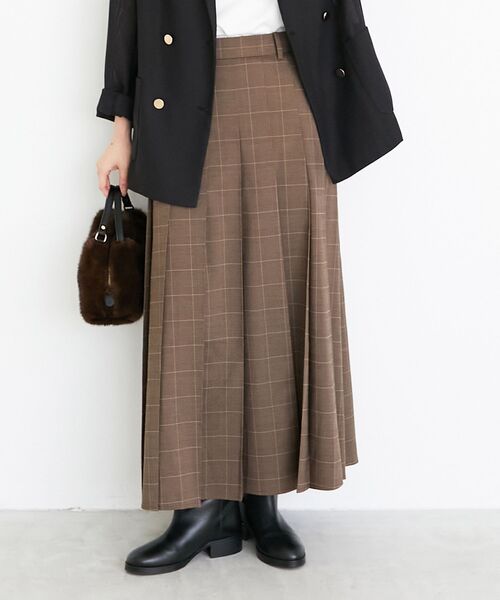 今季トレンドが復活しつつあるプリーツスカートです。やや太幅のプリーツが今年らしいデザインで、腰回りがすっきり見えるようにプリーツをヒップまで中縫いし、裾にかけてプリーツが広がるようなシルエットに仕上げました。落ち着いたカラーと細かいグレンチェック柄でトップスが柄物でも邪魔をせず、どんなアイテムとも合わせやすい1枚です。●ポイント生地は毛羽立ちのないハリのある硬めの生地で、綺麗なシルエットをキープしてくれます。左脇はコンシールファスナー開きになっています。前側のみプリーツになっており、後ろは箱ポケット付きでスッキリとしたデザインになっています。プリーツスカートは座るとプリーツが寄れたり、取れてきてしまったりしますが、後ろがスッキリしているとシワを気にせず着用していただけます。ベルトループが付いているのでアクセントとしてベルトを巻いたり、スカーフやパールネックレスなどもベルトアレンジで巻いても素敵です。●おすすめコーデ生地が厚すぎないので、早い時期から取り入れやすく、カジュアルなTシャツやシンプルなニットなどを合わせて女性らしいアイテムとして合わせてもおすすめです。※取り扱いについては、商品についている洗濯表示にてご確認下さい。※照明の関係により、実際よりも色味が違って見える場合がありますまたパソコン・スマートフォンなどの環境により、若干製品と画像のカラーが異なる場合もございます。※商品の色味は、商品アップ画像をご参照ください。【注意事項】・画像の商品はサンプルです。・サイズ表記はあくまで目安となります。実際の商品と仕様、加工が若干異なる場合があります。