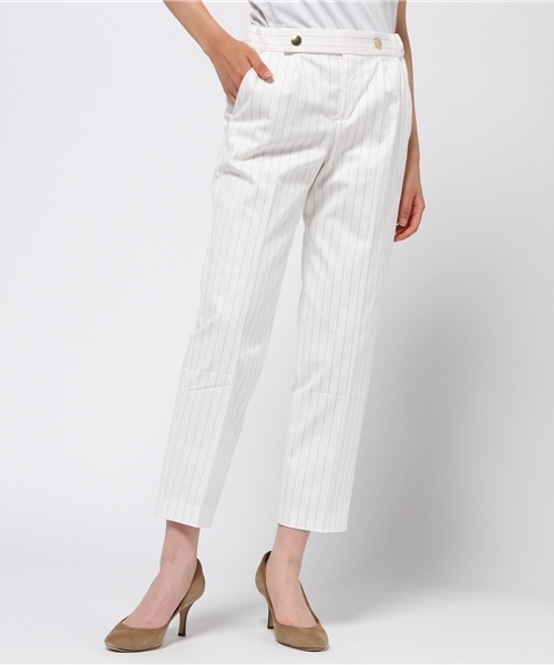 Loungedress(ラウンジドレス) シルエットがきれいな美脚ストライプパンツは、ウエストの金釦がポイントです。 ON/OFFで使えるアイテムとして幅広いコーディネートに使えます。