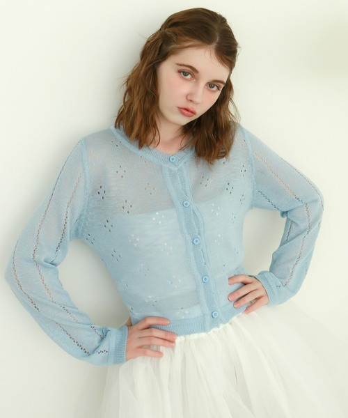 繊細なパンチングと柔らかなシアー感が印象的なカーディガン柔らかなシアー感が印象的なカーディガン袖とボディでパンチングのデザインが違うところも繊細なポイントです。羽織としてもボタンを閉じてトップスとしても活躍してくれるアイテムです。※ピンクの着用画像はホワイトを下にレイヤードしたスタイリングになります。