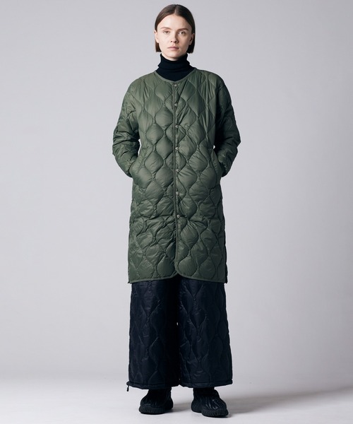 【UNISEX】ミリタリー ワイド ダウンパンツ(TAION-139WDML-1)"保温性抜群、アウターとの相性も良いワイドシルエット、ミリタリーダウンパンツ"アウターとの相性も良いワイドシルエット、ミリタリーダウンパンツです。丈夫なリップストップ生地を使用し、保温性に優れた800FPのダウンを採用、ヘチマキルトのダウンステッチでミリタリー感を演出。左右腰にはカジュアルに使える大きめのパッチポケット。単体で履いてもベタつかず、暖かく着応えのある、ミリタリーテイストのダウンです。同シリーズ(MILITARY LINE)のダウンウェアやダウンマフラーなどと合わせていただくこともお勧めします。ーーーーーーーーーーーーーーーー透け感:なし裏地:ポリエステル素材伸縮性:なし光沢感:なし生地の厚さ:普通ーーーーーーーーーーーーーーーー【商品スペック】・5mm角リップストップ生地を使用しています。・800FPの上質なダウンを使用しています。・前たては、上部にYKK金属スナップボタン(TAION刻印)、開きはファスナーを使用しています。・左右腰と左右後ろには、フラップポケットが付いています。・裾には、幅を調整できる紐が付いています。・ご家庭での洗濯も可能です。※収納袋は付きません。※女性用サイズです。【使用シーン】・ベーシックなアイテムで幅広いシーンで活躍します。・お出かけなどのタウンユースはもちろん、登山やキャンプなどのアウトドアシーンでも使える1枚。・ウエストゴムでゆったりワイドなシルエットは、おうち時間のルームウエアとしてもお使いいただけます。【コーディネート】・ベーシックなアイテムなので、トップスにはニットやカットソー、パーカーやスウェットなど合わせるアイテムを選びません。・ロングコートやボアジャケット、ダウンジャケットなど、冬場のアウターとも相性抜群。・ミリタリーラインのダウンジャケット(商品コード:87363966)を合わせたセットアップコーデもおすすめです。・ダウンスカートとレイヤードすればより暖かく。【TAION(タイオン)について】TAIONは、インナーダウン専業ブランドとして培ってきたノウハウを活かし、定番商品から様々なシーンで着用できるインナーダウン商品を開発しています。ーーーーーーーーーーーーーーーー〈TAINOのモノづくり〉・TAIONのダウンは、パーツにダウンを詰めた後にダウンステッチを入れます。そうすることでダウンステッチ周辺にもしっかりダウンが入り、 外気の進入を防ぎ、体温によりダウン内で温まった空気を逃がしにくい構造としています。・TAIONは、様々なインナーダウン商品を展開しています。 カテゴリーや商品用途に合った、最適な生地を選択し採用しています。生地の表面には、*撥水加工をかけることで汚れがつきにくく、裏面にはダウンが吹き出しにくいACコーティングを施しています。(*撥水加工:雨具のような超撥水加工ではありませんのでご注意ください。)・TAIONのダウンステッチ糸には、 生地とダウンに最適な、ダウン専用糸を使用しています。ダウン専用系を使用することで、ダウンの吹き出しを最小限に抑えます。・一般で使用されるダウン(一般:600FP前後)よりも軽くて、 暖かい空気をたくさん含むことができます。*一部800flpではないアイテムもあります。予めご了承ください。ーーーーーーーーーーーーーーーー