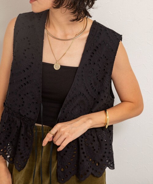 ◇25AW◇MAQWEL【WEB限定】◆Point・コーデに華をプラスしてくれるエンブロイダリーレースのベスト・前後どちらを前にしても着用可能な2WAY仕様・表地は綿100%でシーズンレスで着用可能・暑い時期はキャミソールを合わせて1枚で、涼しくなったらロンTやニットとレイヤードするのがおすすめ・同素材のエンブロイダリーレーススカート(5-0039-5-06-003)とセットでワンピース風にも着用可能●お取扱い上のご注意●末永くご愛用頂くために、アテンションタグを必ずご確認の上、着用又はお取り扱い下さい。気になる商品は、お気に入り登録がオススメです!クーポン情報、入荷情報が、通知されるようになります。※手洗い可※店頭及び屋外での撮影画像は、光の当たり具合で色味が違って見える場合があります。商品の色味は、スタジオ撮影の画像をご参照下さい。※商品画像に関しては出来る限り忠実に表示出来るよう努めておりますが、お客様がご利用のモニターの設定及び特性により、実際の商品と比較し色味に若干の誤差が生じる場合があります。※画像の商品はサンプルとなりますので実際の商品と仕様、加工、サイズが若干異なる場合がございます。