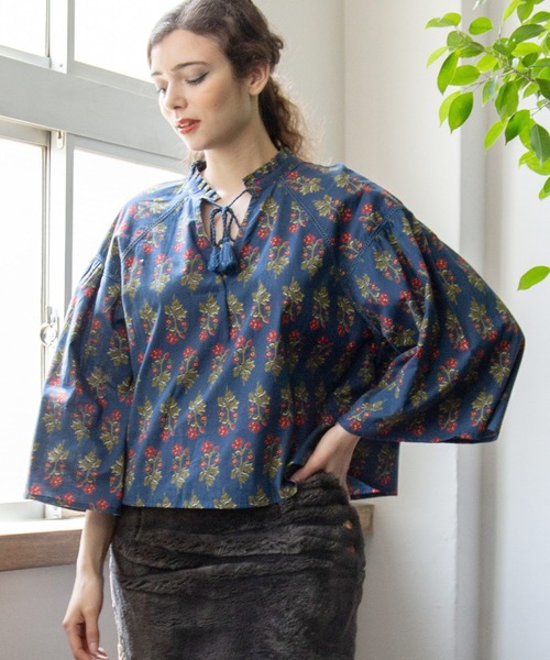ブロックプリント風の草花模様、ボタニカル柄をスクリーンプリントで表現したショート丈トップス。 プリーツフリルの襟やリボン、部分使いのレースが魅力。 袖口が広がったボリューム感のあるラグランスリーブが軽やかさを演出。 肌ざわりの良いインド綿で、リラックス感のある着心地です。 華やかなフォークロアスタイルに◎ ※こちらの商品は1点1点職人による手作りとなります。その為、生地の取り方により柄の配置や形・色合いなど若干異なる場合がございます。(画像は一例です。)あらかじめご了承ください。 ※屋外での撮影画像は、光の当たり具合で色味・カラーが違って見える場合がございます。商品のカラーは、スタジオ撮影の画像をご参照ください。 Amina Collection Co.,LTD.