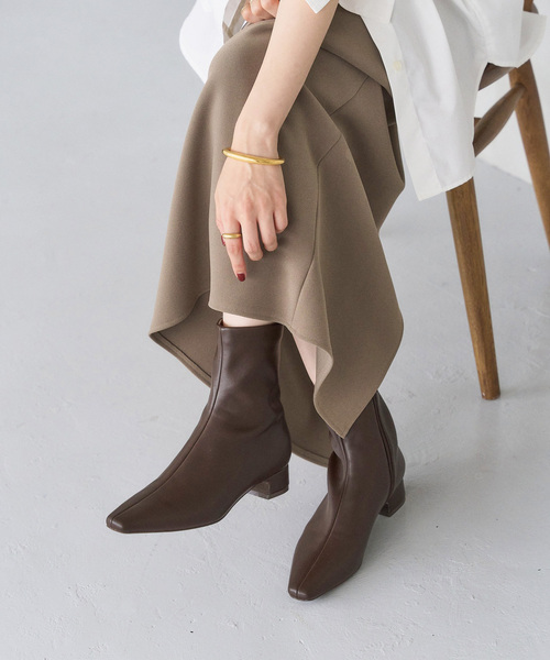 すっきりとしたフォルムと3cmの低寸ヒールでデイリーに使いやすいショートブーツ。パンツ、スカート問わずバランスのとりやすい筒の高さで、足元を美しく見せてくれます。柔らかいアッパー素材とインソールのクッションで足あたりが良く、歩きやすいのも魅力です。踵の縫い割に止水テープ、底面に防水シートを貼っているのでスムースアッパーのブラックAとブラウンは、軽い雨の日でもお天気を気にせずに履いていただけます。**********************【スタッフ着用コメント】《スタッフT》普段サイズ:23.5/着用サイズ:Mサイズ感: Mサイズでぴったり。履き心地: 筒周りは細身に見えますが柔らかいので窮屈感はなく履けました。足馴染みが良いので履いていて楽です。ソックス着用でMで丁度でした。***********************カラーにより素材が異なります。ブラックA・ブラウン 甲材:合成皮革キャメル・ブルー 甲材:合成繊維*防水仕様の商品ではありませんのでご了承ください。*デザイン上、小雨程度まででの着用をおすすめ致します。*耐滑性を保証するものではない為、滑りやすい場所での着用はお避け下さい。*サイズによりヒールの高さが多少前後することが御座います。予めご了承ください。*照明の関係により、実際よりも色味が違って見える場合があります。またパソコン・スマートフォンなどの環境により、若干製品と画像のカラーが異なる場合もございます。*商品の色味は、商品アップ画像をご参照ください。
