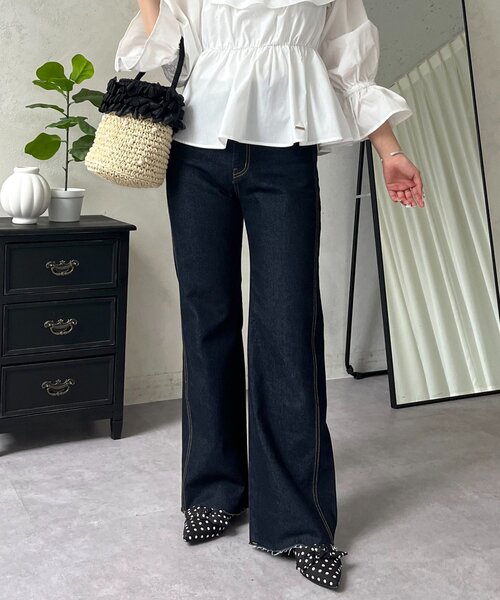 スタイルアップしてくれるセミフレアデニム ●微ストレッチな生地感なので、 普通のデニムよりも動きやすいのに ほどよい締め付け感が美脚見えの秘訣! ●ウエストにゴムが入っているので デニム特有のお腹周りの苦しさも感じにくいのがポイント ●深めのセミフレアが脚長に見せてくれる効果も◎ ●ロック機能付きファスナーを使用 (ロック機能とは、引き手部分を持ち上げるとロックが外れ、ファスナーを開閉できる機能です。 引き手部分を下向きに下げるとロックがかかります。) デニム/フレア/ストレッチ/大人カジュアル -------------------------------------------------------------- 生地の厚さ:普通 伸縮性:あり 透け感:なし 裏地:なし 洗濯方法:ご自宅で手洗い可 -------------------------------------------------------------- ※商品画像はサンプルにて撮影をしておりますので、 実際の商品とは色味や仕様・サイズ等が異なる場合がございますので あらかじめご了承ください。 ※デニムの特性上、染料の特有の匂いがある場合がございます。 また人によっては染料のニオイが多少強く感じられる場合がございます。 ※商品のお取り扱いに関しましては、商品に付属の アテンションカード、洗濯ネームをご覧ください。 ※撮影場所やお使いのモニター環境により若干お色味が 異なる場合がございます。 特にロケの撮影では明るく見える傾向にございます。 ※サイト上ではフリーサイズの表記ですが、商品タグには Mサイズと表記されている場合がございます。 その場合、ワンサイズでのご用意となりますのでサイズミス などではございません。詳しいサイズはサイズスペックを ご確認いただきますようお願い致します。 ※サイト上でのカラー名とお届けした商品に記載されている カラー名が異なる場合がございますので予めご了承ください。 <返品・キャンセルについて> ・着用・洗濯後の返品は致しかねます。 ・商品到着後、着用前に商品を確認して頂きますようお願い致します