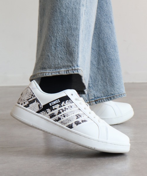 The California Sports Company"K-SWISS" デイリーユースに大活躍 -デザイン・ディテール- ブランドの象徴的な5ストライプに、パイソン柄のコンビが映えるレザータッチのコートスニーカー。 インソールはクッション性があり、足への負担も軽減し疲れにくくなっています。 エッジを効かせたデザインで、カジュアル、モードやストリートにもフィット。 デイリー使いはもちろん、ちょっとしたお出かけから旅行まであらゆるシーンで活躍してくれます。 -スペック- ローカットタイプ 紐あり ■K-SWISS/ケースイス スイス人のアート・ブルナーとアーネスト・ブルナー兄弟が米国カリフォルニア州に移住し設立した『K-SWISS』(ケースイス)。テニスシューズに世界で初めてレザーを使用。シンプルで高機能かつスタイリッシュなデザインを追求しその完成度から世界中のテニスプレイヤーからの信頼を得ることに成功。 ブランド誕生から40年以上を経て「The California Sports Company」として、カジュアルからパフォーマンスのシューズ、アパレルをデザイン、生産する総合スポーツブランドに成長しています。 ★商品のお気に入り登録→【カートに入れる】右側のハートマークをクリック 完売カラーの再入荷通知や、ラスト1点の通知、セールの通知も受け取ることができます。 ※店頭及び屋外での撮影画像は、光の当たり具合で色味が違って見える場合があります。またご覧いただきますモニターや使用環境により実際の商品と多少色味が異なって表示される場合がございます。 予めご了承をお願いいたします。